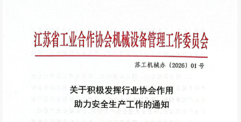 贯彻落实江苏省安委办、省委社会工作部、省民政厅、省工商联共同印发《关于发挥行业协会商会作用助推企业安全生产的意见》,着力发挥行业协会政企桥梁纽带作用,以引导会员单位强化行业自律、健全安全制度、规范经营行为、构建共治体系,促进安全生产从“政府监管”向“多元共治”转型为充分发挥行业协会在安全生产工作中的“政企桥梁”与“共治纽带”作用,助力会员单位进一步提升安全管理水平,强化安全生产协同共治效能,江苏省工业合作协会机械设备管理工作委员会现将有关事项通知如下: